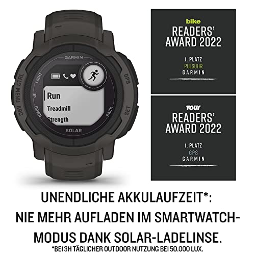 NIE MEHR AUFLADEN: Die Instinct 2 Solar GPS-Smartwatch macht Sie noch ungebundener: Dank Solar-Ladelinse hält der Akku im Smartwatch-Modus sogar unendlich – Sie müssen nicht mehr ans Aufladen denken. (Bei 3h täglicher Outdoor-Nutzung bei 50.000 LUX Lichtverhältnissen)