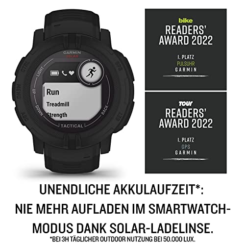 NIE MEHR AUFLADEN: Die Instinct 2 Solar Tactical GPS-Smartwatch macht Sie noch ungebundener: Dank Solar-Ladelinse hält der Akku im Smartwatch-Modus sogar unendlich – Sie müssen nicht mehr ans Aufladen denken. (Bei 3h täglicher Outdoor-Nutzung bei 50.000 LUX Lichtverhältnissen)