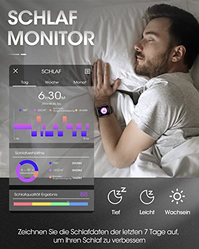 【Gesundheit „sichtbar“ machen】 7/24 Gesundheitsüberwachung und Schlafmonitor. Besser schlafen, weniger Stress und effektiv trainieren. Bietet intelligente Gesundheitsüberwachungsfunktionen wie Echtzeitüberwachung der Herzfrequenz und Schlafqualität (Tiefschlaf, Leichtschlaf) den ganzen Tag über; Fitness Tracker Herren synchronisiert und lädt detaillierte Daten der letzten 7 Tage in die App hoch, damit Sie Ihren körperlichen Zustand besser verstehen und Ihren Lebensstil anpassen können.