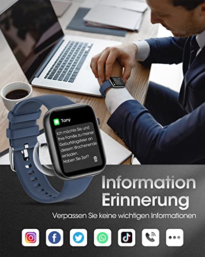 【Drehbare Krone + 1.8″ HD-Bildschirm】 Drehbare Multifunktions-Krone, eine Taste zum einfach umschalten und scrollen der aktuellen Schnittstelle. Ausgestattet mit einem 1,8″ HD-Bildschirm + massives Zifferblatt + 2 Silikonband (schwarz und blau). Wenn Sie die Smartwatch Herren mit Bluetooth benutzen, können Sie Ihr Lieblingsfoto oder -bild als Ziffernblatt in der App einstellen, mit dem großen HD-Bildschirm, sobald Fitnessuhr aufleuchtet, wird die Schönheit sichtbar.