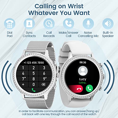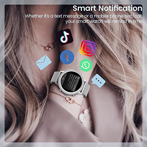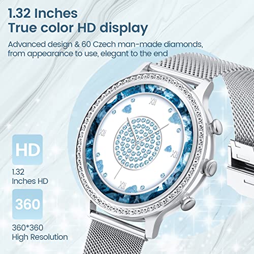 Smartwatch Damen mit Telefonfunktion 1.32″ Zoll HD AKUMAKA Diamond Love, Armbanduhr SpO2 Pulsmesser Schlafmonitor Menstruationszyklus Schrittzähler Musikplayer Android iOS Silber, Geschenke für Frauen