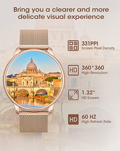 ⌚【Tragen Sie Schönheit am Handgelenk】Haben Sie eine neue Split-Screen-Funktion. Die weibliche Smartwatch Damen mit Telefonfunktion verfügt über einen großen 1,32-Zoll-TFT-HD-Großbildschirm, kombiniert mit einer hohen Auflösung von 360×360, wodurch das Sichtfeld klarer wird. Ein schlankes und leichtes Körper mit eleganten Goldstahlarmband und bequemen Silikonarmband sowie über 180 Zifferblättern und DIY-Zifferblättern zur Auswahl machen diese Smartwatch damen zum perfekten Accessoire für Sie.