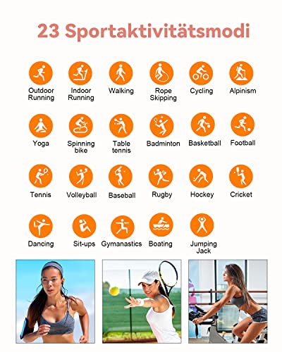 ⌚【23 Sportmodus & IP68 wasserdicht】 Dieser Aktivitätstracker unterstützt 23 verschiedene Trainingsarten: Laufen, Laufband, Fitness, Radfahren, Klettern, Yoga, Gehen, Wandern, Spinning, Steps. Erfahren Sie mehr über Ihre Trainingsdaten mit diesem Fitnesstracker. Mit IP68 wasserdicht können Sie diese Smartwatch zum Schwimmen tragen, sehr leicht, nur 34 Gramm